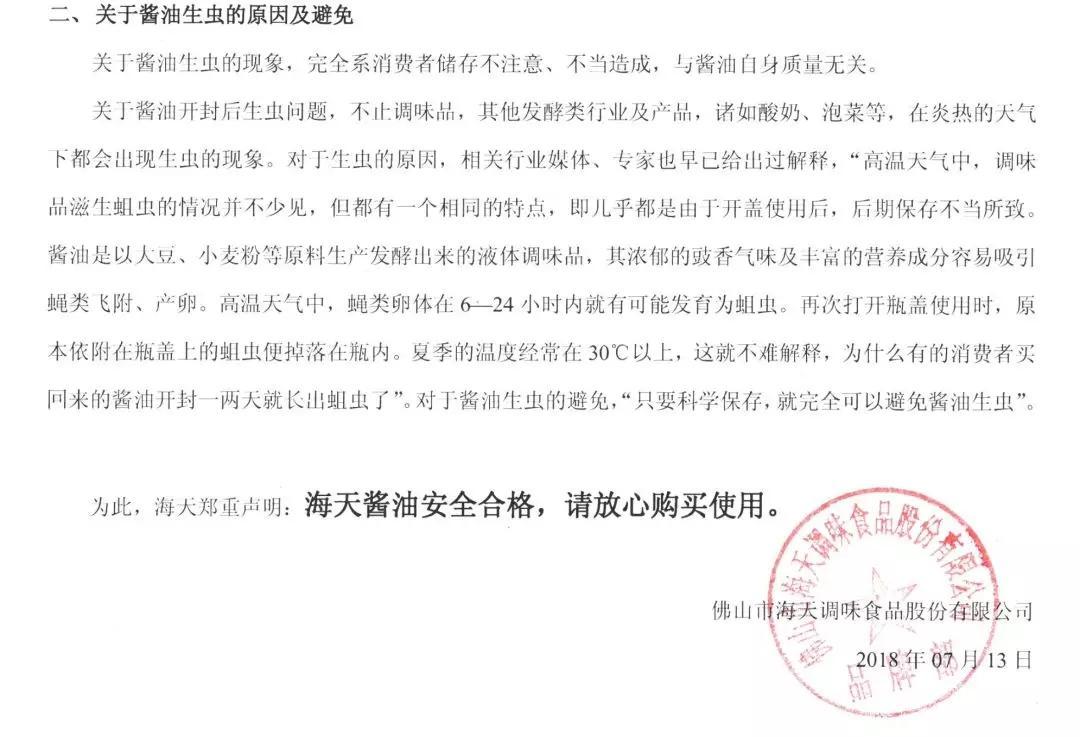 7月13日,海天味業(yè)在其官網(wǎng)發(fā)布“海天醬油安全合格,請(qǐng)放心購買使用”聲明。聲明稱,海天味業(yè)出場(chǎng)的產(chǎn)品均按照國家標(biāo)準(zhǔn)生產(chǎn),在出廠前均經(jīng)過檢驗(yàn)合格。因此,未開封的產(chǎn)品不會(huì)有活蟲和蟲卵生長(zhǎng)。至于醬油開封后出現(xiàn)蛆蟲,海天味業(yè)解釋說,不止調(diào)味品,酸奶、泡菜等發(fā)酵產(chǎn)品在炎熱的條件下也容易生蟲。而醬油生蛆“完全是消費(fèi)者儲(chǔ)存不當(dāng)造成,與醬油自身質(zhì)量無關(guān)”。