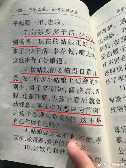 “姑娘要多干活,少花錢(qián),別嘴饞,現(xiàn)在的姑娘正好反過(guò)來(lái)了,少干活,多花錢(qián),嘴還饞,這就違背了姑娘道……”網(wǎng)友對(duì)小冊(cè)子上的一些話(huà)表示憤怒,認(rèn)為這是打著傳統(tǒng)文化的旗號(hào)禁錮人們思想的歪理,內(nèi)容歧視女性、挑撥家庭和睦、挑戰(zhàn)醫(yī)學(xué)常識(shí)。