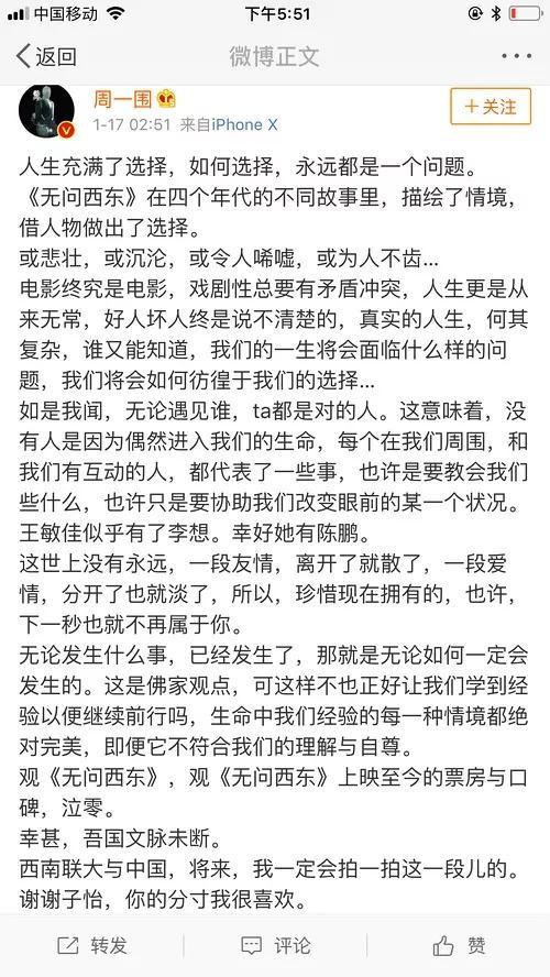 這要是兩位單身,或許還好一點,關(guān)鍵是這可是兩個為人父母的,說出這么高山流水覓知音的話,確實不合適。不但如此,周一圍的夫人,朱丹在微博里一直為老公賣力宣傳。