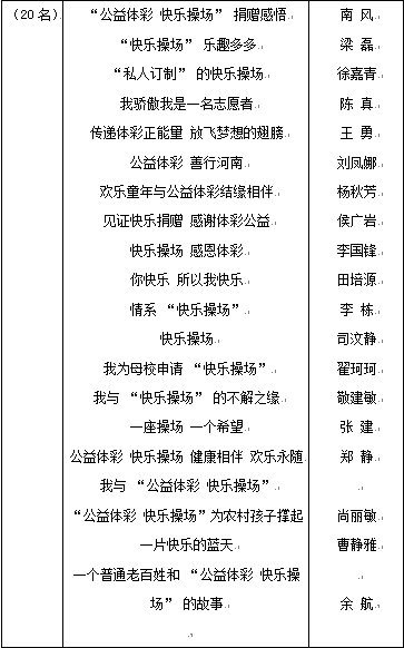 據(jù)統(tǒng)計(jì),活動(dòng)期間共收到省內(nèi)外征文272篇,其中不乏很多優(yōu)秀作品。在評(píng)選工作中,很多作品都寫出了真情實(shí)感,感人至深的故事。征文作者中有受捐助小學(xué)的老師和學(xué)生,有受助小學(xué)學(xué)生的家長(zhǎng), 有為家鄉(xiāng)申請(qǐng) “快樂操場(chǎng)” 的體彩銷售員和體彩工作人員,還有見證了 “快樂操場(chǎng)” 活動(dòng)的媒體記者,更有大學(xué)生志愿者。另外,還收到很多郵寄到報(bào)社的手寫稿件。感謝全國(guó)各地的讀者朋友對(duì)公益事業(yè)和本次活動(dòng)的支持, 我們會(huì)從中擇優(yōu)選取部分稿件在大河報(bào)彩票版、 大河客戶端彩票頻道上刊發(fā), 以此作為答謝。