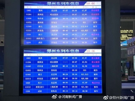 由于河南中南部部分地區(qū)降雪,映象網(wǎng)記者從鄭州東站獲悉,根據(jù)目前車(chē)站掌握的情況,截止1月3日20點(diǎn)30分,有G2208、G670、G558等8趟途徑鄭州東站的列車(chē)晚點(diǎn)。