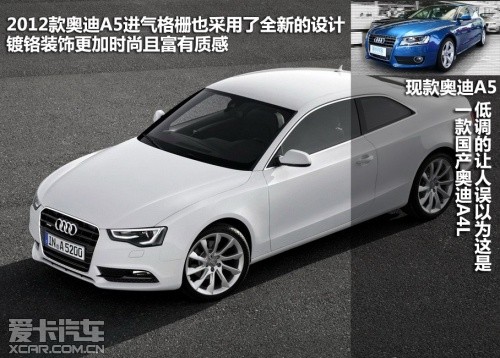 2012款奧迪A5屬于中期改款車型,在外觀、內(nèi)飾、動力和底盤上都有較為明顯的變化。除了A5和其高性能版S5的稱謂,新車主要細(xì)分為雙門Coupe版、Sportback版以及Cabriolet敞篷版。