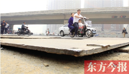 路人說:鐵板本來就比路面滑,再加上附近一直施工,經常會有細土或砂石落在上面,就更加光滑,電動車、自行車和行人走在上面,不小心的話很容易滑倒。如果再碰到鐵板的棱角,后果就不堪設想。