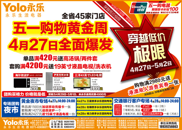 據(jù)悉,今年五一,永樂電器向中外800多家電器廠家拋出30億規(guī)模的采購(gòu)大單。借助于30億大單的規(guī)模優(yōu)勢(shì),永樂將于4月27日發(fā)起五一黃金周降價(jià)潮,其中,彩電產(chǎn)品全場(chǎng)7折起,50英寸3D彩電價(jià)格更是首次降價(jià)幅度超過25%,合資品牌46英寸LED網(wǎng)絡(luò)電視跌破7000元,合資品牌三洋32英寸液晶電視僅售1699元;空調(diào)方面,格力、美的、海爾、志高、伊萊克斯、TCL、三洋等知名空調(diào)廠商的2012主打產(chǎn)品五一期間全部上陣永樂各大賣場(chǎng),舉行大型特賣活動(dòng),使空調(diào)價(jià)格下降25%左右。1匹空調(diào)永樂五一最低降至2000元以下,而且不限量供應(yīng),更驚爆的還有一款1.5P的空調(diào)僅售價(jià)1999元,且大量供應(yīng)100臺(tái);洗衣機(jī)價(jià)格平均降幅達(dá)30%,冰箱產(chǎn)品平均降幅也在30%以上,對(duì)開門冰箱首度跌破3500元。此外,廚衛(wèi)產(chǎn)品也將出現(xiàn)全年最大幅度的讓利優(yōu)惠,煙灶、熱水器等產(chǎn)品將以直降為主,購(gòu)買套餐組合優(yōu)惠力度更大,方太經(jīng)典歐式煙灶套餐僅3700元左右,華帝廚衛(wèi)全場(chǎng)5折起,伊萊克斯電熱水器驚爆價(jià)999元;暢銷小家電也將大幅優(yōu)惠讓利。3C產(chǎn)品優(yōu)惠力度更大。其中HTC、索尼愛立信、諾基亞等品牌新品、暢銷品超低價(jià)銷售,千元智能手機(jī)大量供應(yīng);數(shù)碼產(chǎn)品方面,佳能、索尼、尼康、奧林巴斯、三星等品牌全面低價(jià)讓利,降價(jià)幅度高達(dá)20%。1200萬數(shù)碼相機(jī)跌破700元。最熱門的佳能600D單反數(shù)碼僅售5287元另加送多重禮品;同時(shí),電腦產(chǎn)品也有不同程度的優(yōu)惠,戴爾2G內(nèi)存、500G硬盤、雙核處理器、獨(dú)立顯卡的筆記本電腦永樂專享價(jià)僅2999元。