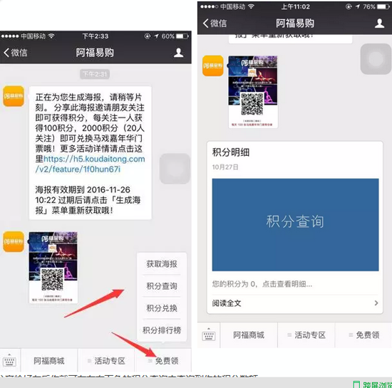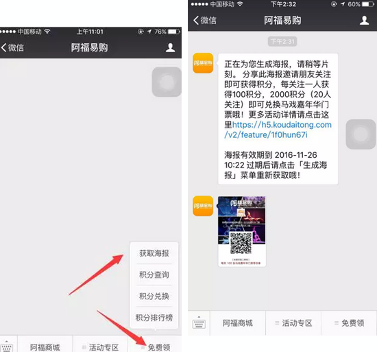 首先點(diǎn)擊右小角的免費(fèi)領(lǐng),然后點(diǎn)擊分享海報(bào),分享給好友關(guān)注阿福易購(gòu)的微信公號(hào)就可獲得積分。一個(gè)好友一百個(gè)積分,20個(gè)好友就可獲得2千個(gè)積分就能兌換馬戲門(mén)票。