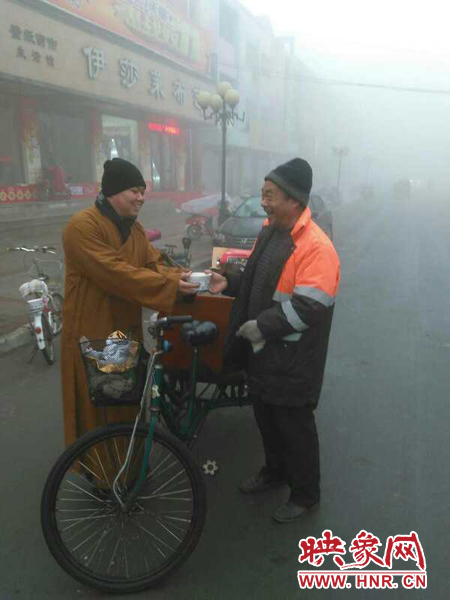 僧人名叫釋妙亮,是滎陽市豫龍鎮(zhèn)興國寺法師。他說,早上6天他們出發(fā)了,截止早上7時30分,他們已經(jīng)免費送了三桶臘八粥。