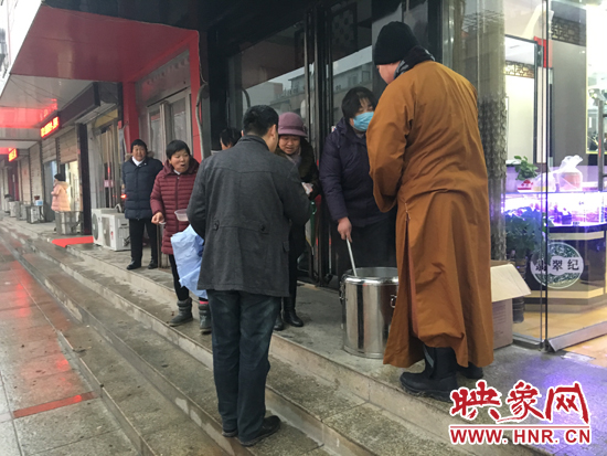 5日早上7點雖然下著小雨,滎陽市康泰路于廣武路交叉口西約100米路北,一家“翡翠紀”的店門口前卻是熱鬧非凡,一名身著僧服的僧人正在給過往市民從保溫桶里盛出熱氣騰騰的臘八粥。商家老板,上學學生,環(huán)衛(wèi)工人等紛紛來到門前,端著臘八粥喝了起來。