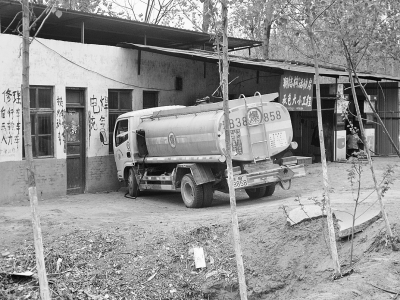 一輛油罐車正在給一處非法加油點送油