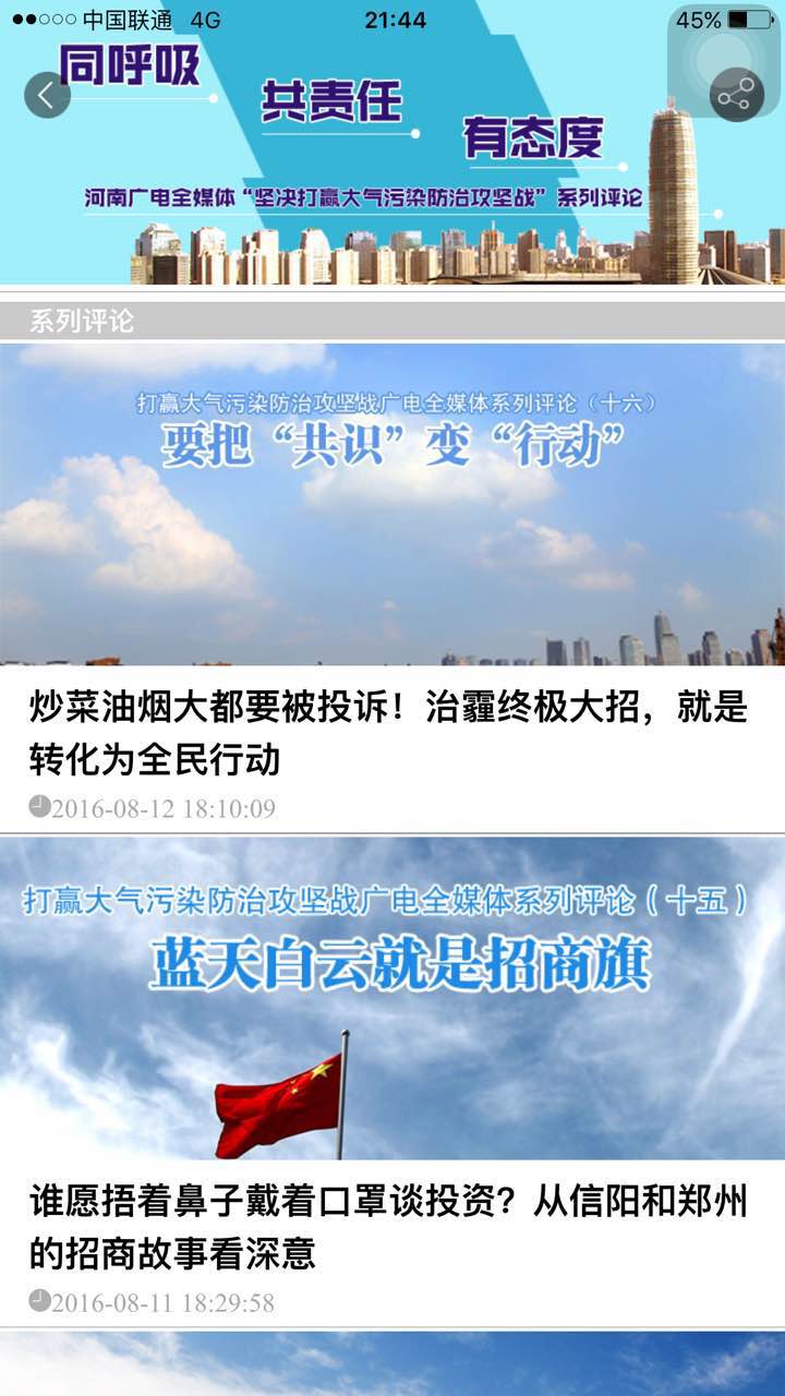 從7月份開(kāi)始,河南開(kāi)始打響大氣污染防治攻堅(jiān)戰(zhàn),河南廣電全媒體推出“堅(jiān)決打贏大氣污染防治攻堅(jiān)戰(zhàn)”系列評(píng)論,到8月13日已經(jīng)推出了16篇。連日來(lái),系列評(píng)論在社會(huì)上引起了方方面面的關(guān)注,產(chǎn)生了巨大影響。8月14日晚上,央視《新聞聯(lián)播》,也關(guān)注了河南大氣污染防治攻堅(jiān)戰(zhàn)。