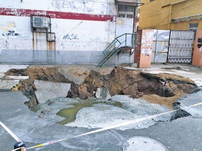 王先生說,今年7月,該處的供水管道曾爆管過一次,但當(dāng)時該處只發(fā)生一次小范圍塌陷,坑也沒這么深。沒想到,時隔2個月,該處再次管道爆裂、地面塌陷。