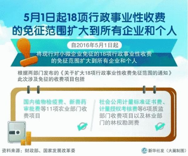 4月28日,財政部網(wǎng)站發(fā)布《關(guān)于擴大18項行政事業(yè)性收費免征范圍的通知》:自5月1日起,擴大18項行政事業(yè)性收費免征范圍。