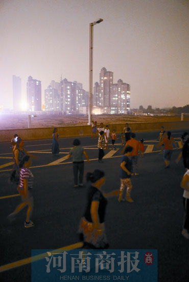 前天晚上7時(shí)30分,鄭州市南三環(huán)與京廣路交叉口向南500米路西,幾名市民沿著高架橋匝道向二層走去。高架橋二層橋面西側(cè),人們?nèi)宄扇?,大人們邊走邊聊天,小孩兒則在車道上嬉笑玩耍。東側(cè),一名女士大步快速地向北走,“不刮風(fēng)不下雨,沒事兒就來這鍛煉?!贝送?,還有30多名市民正在跳廣場舞。