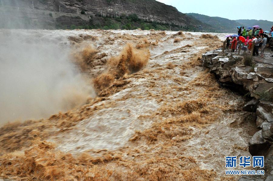 8月2日,游客在山西吉縣黃河壺口瀑布景區(qū)游覽觀(guān)瀑。受上游強(qiáng)降雨天氣影響,黃河干流晉陜峽谷水位暴漲,濁流滾滾奔騰而下,使得位于山西吉縣和陜西宜川交界的壺口瀑布瀑面驟然變大,形成400多米寬的特大瀑布群,氣勢(shì)磅礴,蔚為壯觀(guān)。新華社發(fā) 呂桂明 攝 圖片來(lái)源:新華網(wǎng)