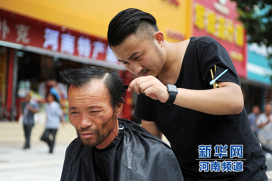 從7月21日開始,一位名叫紅濤的理發(fā)師每逢周二在鄭州街頭免費為流浪人員理發(fā),他希望用此項行動呼吁大家關(guān)注街頭流浪人員群體。紅濤說,他還打算免費為農(nóng)民工等群體理發(fā),讓他們感受到社會的溫暖。新華社發(fā)(馮大鵬 攝)