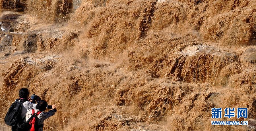 9月13日,游客在山西省吉縣黃河壺口瀑布景區(qū)拍攝瀑布。近日,受上游降雨和水庫調(diào)節(jié)放水影響,黃河干流迎來秋汛,位于山西吉縣和陜西宜川縣交界的壺口瀑布水量大增,形成壯美瀑布,吸引眾多游人前來觀瀑。新華社發(fā)(呂桂明 攝)