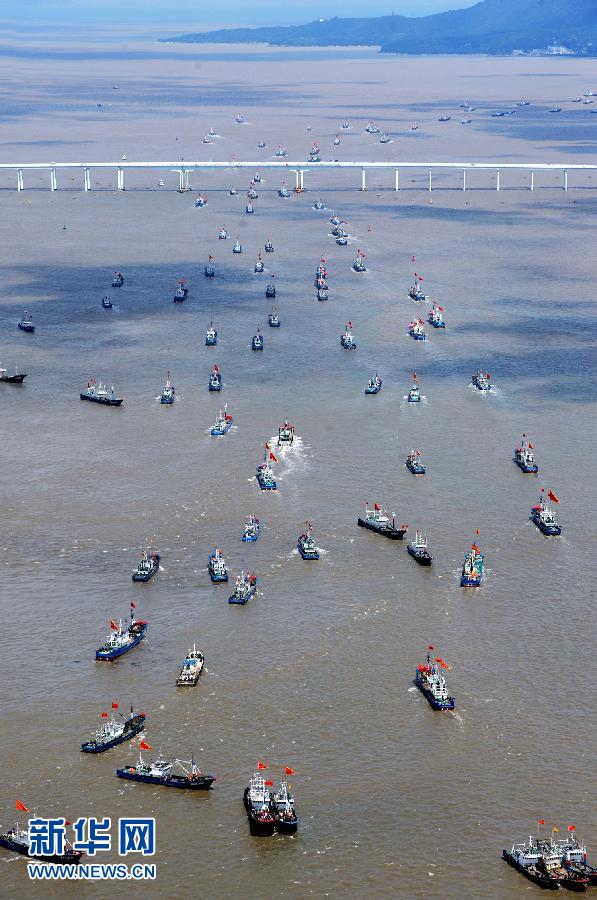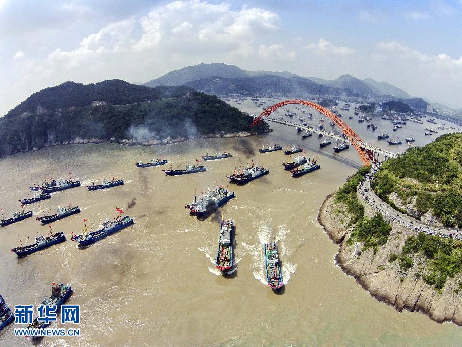 9月16日,浙江省舟山市沈家門漁港的漁船出港經(jīng)過朱家尖大橋開赴漁場。當日,為期3個半月的東海伏季休漁結(jié)束,眾多漁船劈波斬浪,開往漁場。 新華社發(fā)(華志波 攝)