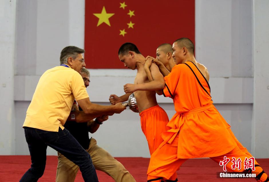 9月20日,河南登封,前來參加2015鄭州航展的國(guó)際特技飛行員,在登封一所武校內(nèi)用力想拔掉吸在少林弟子肚子上的飯碗,但拼盡全力,也未能成功。 中新社發(fā) 王中舉 攝