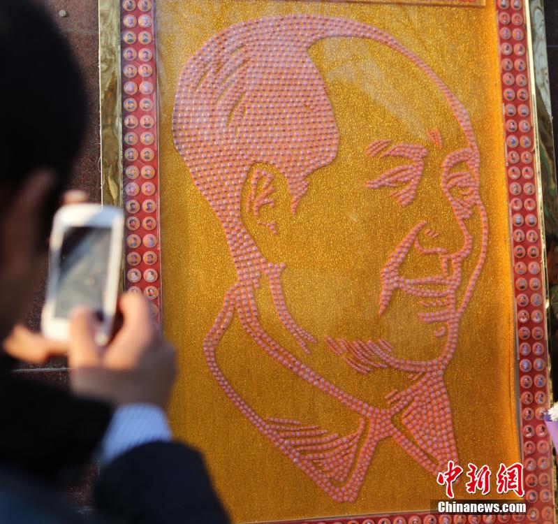 12月26日,是毛澤東誕辰122周年紀念日,鄭州退休老軍人李廷林制作的徽章版毛澤東畫像在河南鄭州紫荊山廣場展出,該畫像總共由1828枚徽章圍成。中新社記者 王中舉 攝