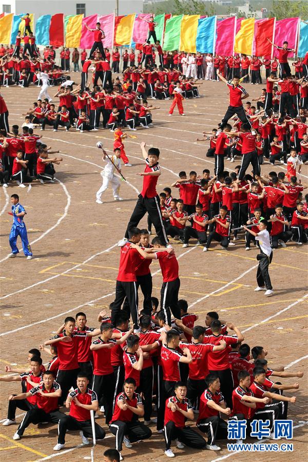 4月7日,在河南登封少林塔溝武術(shù)學(xué)校練功場(chǎng),上課間操的學(xué)員疊起人塔。當(dāng)日,河南登封少林塔溝武術(shù)學(xué)校2016年“春訓(xùn)”拉開帷幕,2.6萬名學(xué)員同上陣,進(jìn)行隊(duì)形變換、十八般兵器、少林硬氣功、少林集體棍等多種功法演練。“春訓(xùn)”是少林塔溝武術(shù)學(xué)校每年春季開展的一項(xiàng)強(qiáng)化訓(xùn)練活動(dòng),旨在提升學(xué)員的耐力和競(jìng)技狀態(tài)。新華社發(fā)(牛書培 攝)