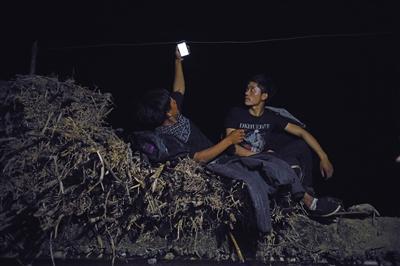 圖為5月12日晚上,村民坐在玉米稈上搜尋手機(jī)信號,村里沒有發(fā)射塔,全靠山下發(fā)射到的微弱信號接收手機(jī)短信和打電話。9點(diǎn)多鐘,勒爾小學(xué)校長吉克拉者帶著15個(gè)孩子到山下,其中有陳古吉的5個(gè)孩子,4個(gè)女孩1個(gè)男孩,最小的男孩叫陳木黑,6歲,讀學(xué)前班。爬山開始前,陳木黑被陳古吉系上背包繩。前面由一個(gè)家長引路,中間一個(gè)家長,陳古吉帶著陳木黑走最后,6歲的陳木黑已經(jīng)在這條路上,上上下下幾十次了。在爬垂直藤梯的時(shí)候,陳古吉會從后面微微提繩,讓兒子能夠省點(diǎn)力氣,跟上前面的哥哥姐姐。在通過沒有任何附著物的崖壁上的道路時(shí),陳古吉就格外小心,緊抓繩子的手有時(shí)青筋暴起。他說,前些日子,一個(gè)娃滑了一下,幸好崖邊的藤條擋住了,才撿回一條命。