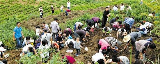 昨天,記者驅(qū)車(chē)來(lái)到了這個(gè)幾乎是磐安縣最東面的偏遠(yuǎn)鄉(xiāng)鎮(zhèn)胡宅,事實(shí)上,后張村就處于磐安和新昌交界的地方。中午時(shí)候,這個(gè)人口上千的村落幾乎已經(jīng)被各種各樣的車(chē)子停滿(mǎn)了,有奔馳越野車(chē),也有面包車(chē)和電瓶車(chē),有浙G、浙D、浙A等省內(nèi)牌照的,也有皖N的。這里的山頭傳說(shuō)是死火山形成,所以土壤肥沃,幾乎整塊都被犁出來(lái),種上莊稼,最多的是茶樹(shù)。一眼望去,尋寶的人員估計(jì)有六七百人,有人在挖,也有人是在圍觀。村民說(shuō),來(lái)來(lái)回回,當(dāng)天起碼涌進(jìn)來(lái)上千人在尋寶。
