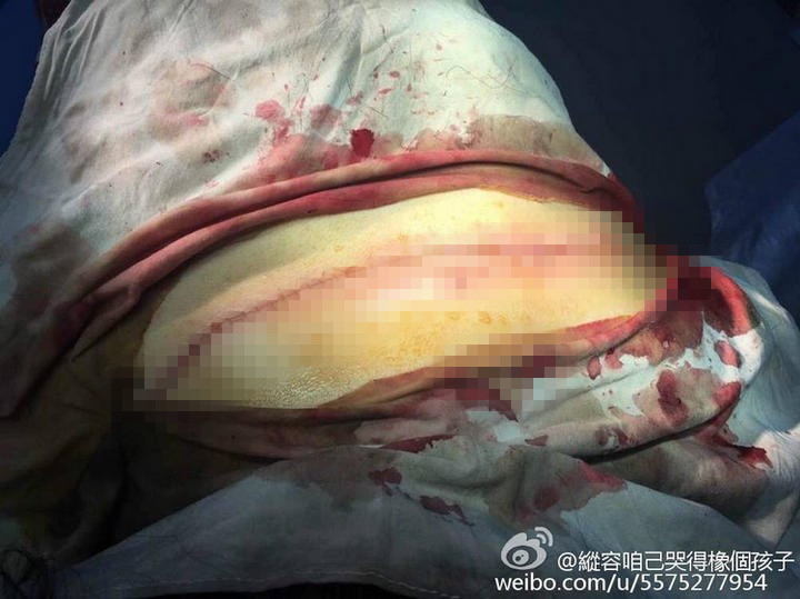 在醫(yī)院治療時(shí),有人幫她拍下一組照片。其中一張,該年輕女子趴在手術(shù)臺,可明顯看到其后頸下方15厘米處,有一條從左手腋窩延生至右肩的傷口,醫(yī)生正對其進(jìn)行手術(shù)。而另一張圖片,是其傷口縫合后情況,背部有一條如蜈蚣般的傷痕,令人觸目驚心。