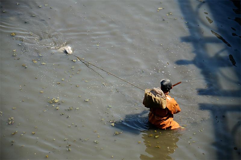 仔細觀察才發(fā)現(xiàn)男子們都身穿連體防水衣,在蹲在發(fā)臭的河水中,將網(wǎng)撒到河底后左右攪拌,河底的淤泥被攪了上來,河水立刻變得非常渾濁,搖晃漁網(wǎng)篩去淤泥后,把剩下的紅線蟲倒入塑料袋中。