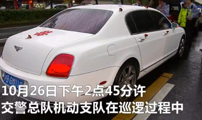 下午2點(diǎn)45分許,上海交警總隊(duì)機(jī)動支隊(duì)巡邏時(shí),在周家嘴路近大連路處發(fā)現(xiàn)一路婚車車隊(duì),共計(jì)5輛車,其中領(lǐng)頭的是懸掛“滬BGM018”牌號的白色賓利歐陸跑車。后經(jīng)查實(shí),此車為套牌車。