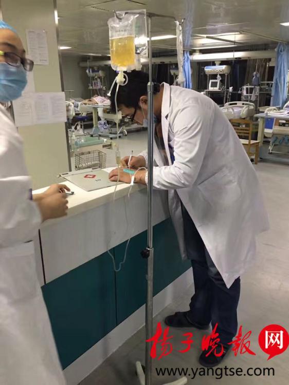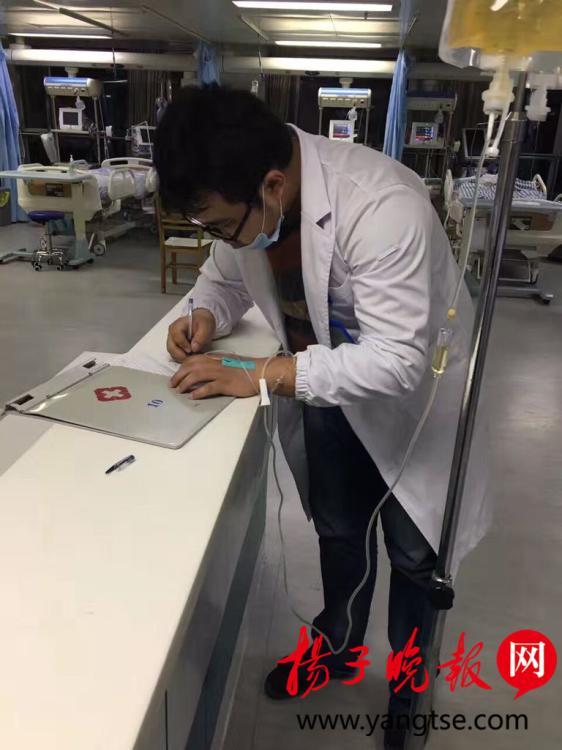 10月29日,一位身穿白大褂帶著口罩的男醫(yī)生,一邊打點(diǎn)滴,一邊為病人下醫(yī)囑的照片,出現(xiàn)在記者的微信朋友圈中。記者獲悉,這位醫(yī)生是江蘇鹽城市濱??h人民醫(yī)院的一名醫(yī)師,當(dāng)時(shí)正在搶救病人,現(xiàn)場(chǎng)非常感人。圖片來源:揚(yáng)子晚報(bào)網(wǎng)