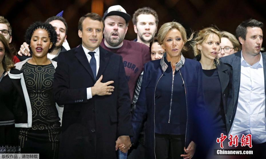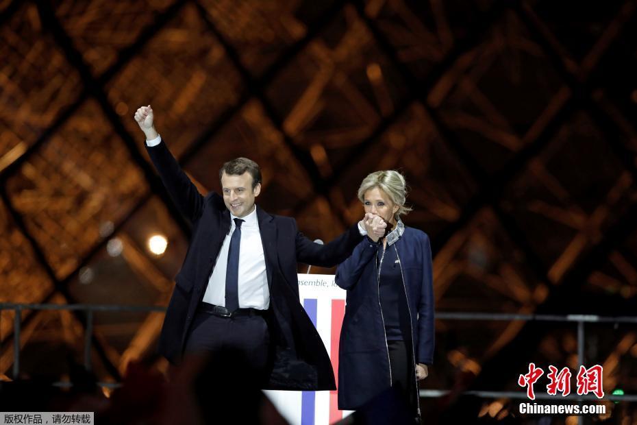 巴黎時間5月7日晚,法國總統選舉第二輪投票初步計票結果顯示,中間派獨立候選人、“前進”運動領導人埃馬紐埃爾·馬克龍以大幅優(yōu)勢擊敗極右翼政黨“國民陣線”候選人馬麗娜·勒龐。年僅39歲的馬克龍由此成為法國史上最年輕的總統,也成為世界上最年輕的大國領導人。圖為馬克龍(左二)和妻子布麗吉特(右二)在慶祝勝選的集會上向支持者致意。中新社記者 龍劍武 攝
