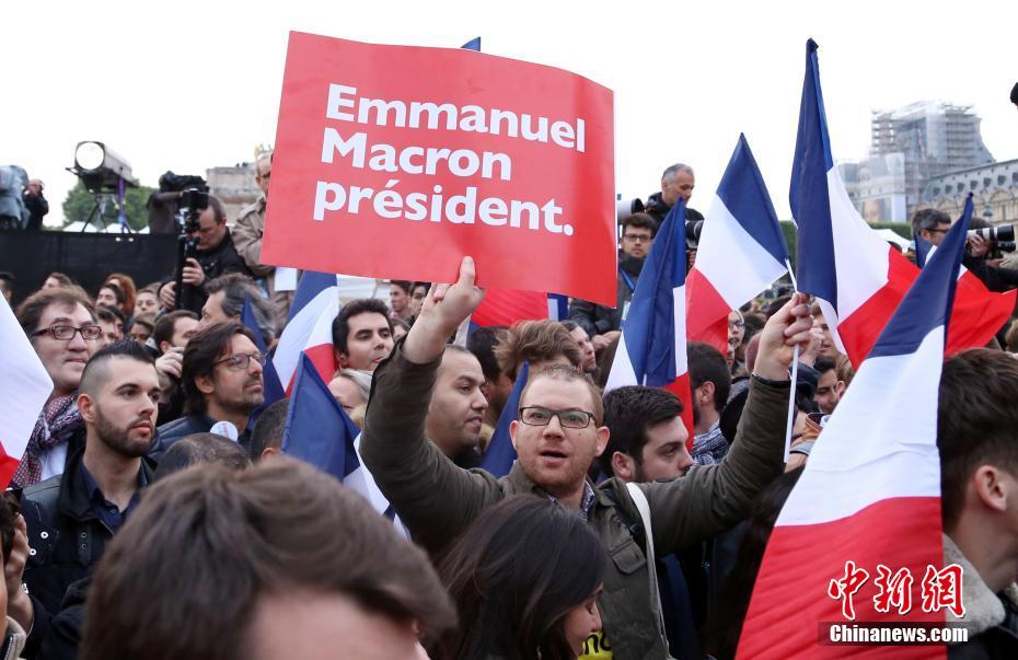 巴黎時間5月7日晚,法國總統選舉第二輪投票初步計票結果顯示,中間派獨立候選人、“前進”運動領導人埃馬紐埃爾·馬克龍以大幅優(yōu)勢擊敗極右翼政黨“國民陣線”候選人馬麗娜·勒龐。年僅39歲的馬克龍由此成為法國史上最年輕的總統,也成為世界上最年輕的大國領導人。圖為馬克龍的支持者在慶祝勝選的集會上揮旗。中新社記者 龍劍武 攝