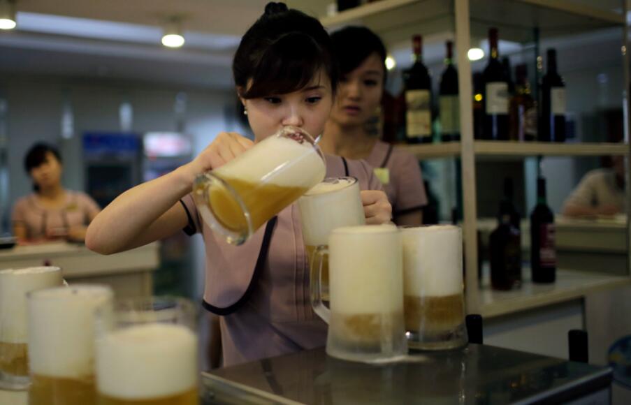 朝鮮服務(wù)員在為客人倒啤酒。