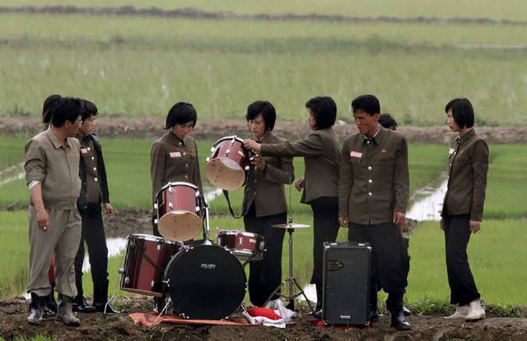 在黃金坪舉辦完歡迎農(nóng)民的儀式后,樂隊成員再在田間檢查鼓。
