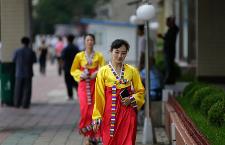 平壤街道上散步的店員。