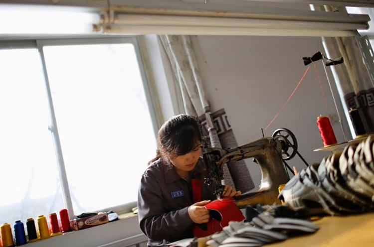 在丹東郊區(qū)的一個臨時工廠里,一位朝鮮女工正在做足球鞋。