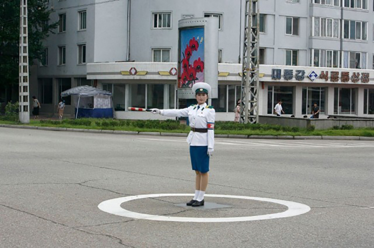 一位朝鮮的女交警站再平壤的路上。