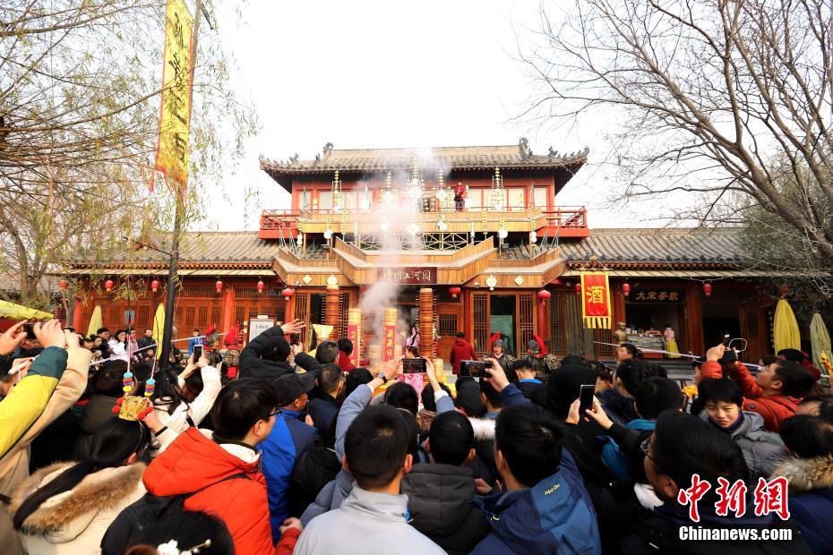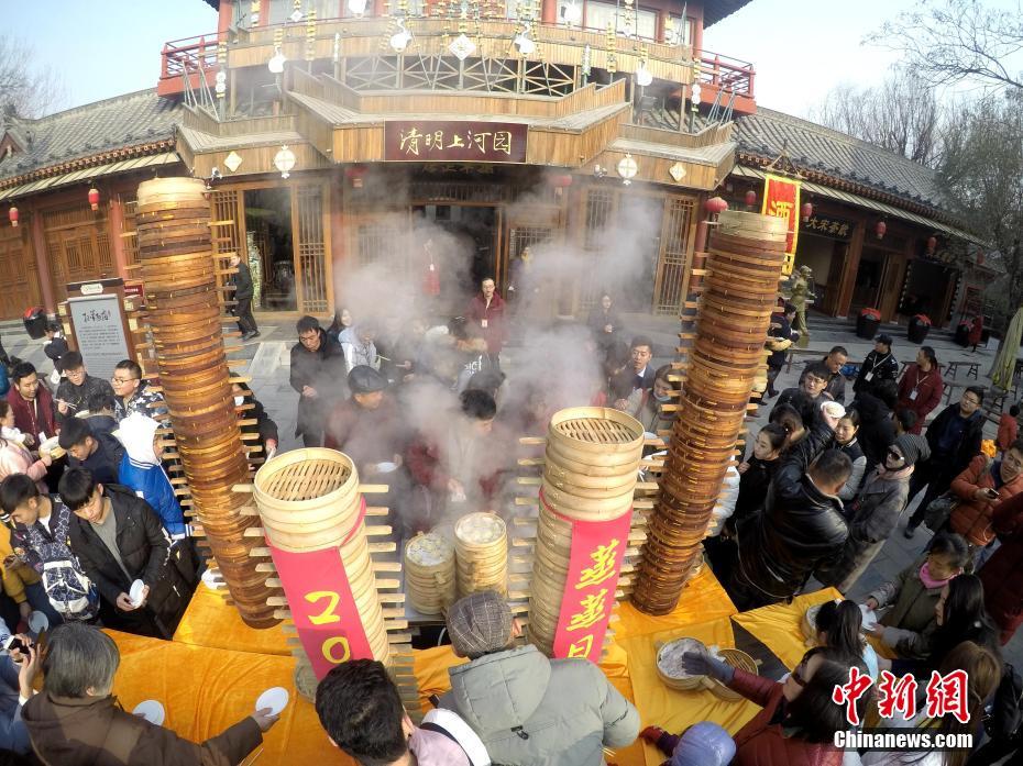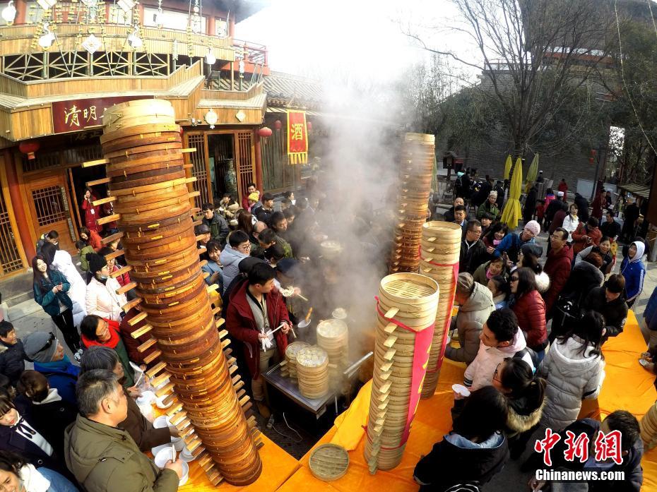 2018年1月1日,河南開封清明上河園孫羊正店門前,現(xiàn)場高高疊起的小籠包熱氣騰騰,小籠包上喜慶的紅字寫著“2018”“蒸蒸日上”。“宋徽宗”帶領“后宮佳麗”為游客免費發(fā)放剛剛蒸好的小籠包,寓意新的一年“蒸蒸日上”,吸引數(shù)千名游客爭相品嘗求好運。據(jù)清明上河園市場部石經理介紹,為了給游客送上這份新年祝福,清明上河園啟用了多個地方一起蒸小籠包,當天共準備了2018籠開封名吃“灌湯包”,在多個發(fā)放點陸續(xù)為民眾送上新年的“免費午餐”,祝愿大家都能夠在新的一年里“蒸蒸日上”。中新社記者 王中舉 攝