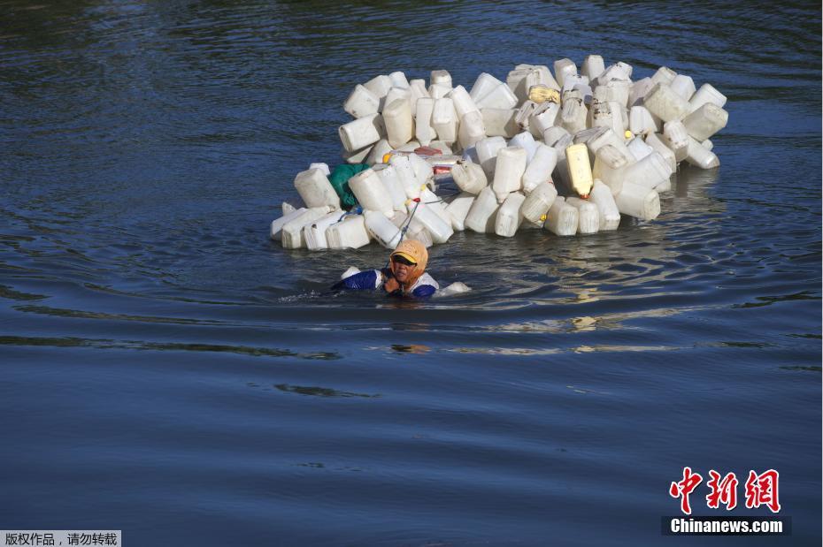 當(dāng)?shù)貢r(shí)間2018年3月21日, 印尼西蘇拉威西省Tinambung,村民Mama Hasria和其他當(dāng)?shù)嘏悦刻毂澈笙抵s200個空壺子逆流而上,到河上游為他們的社區(qū)打干凈的水。