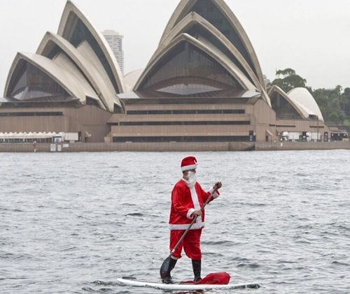 如今圣誕老人出門不單是靠雪橇了,在澳大利亞,這里高能的圣誕老人可以在劃槳板上表演水上漂來慶祝圣誕。據(jù)報道,澳大利亞當(dāng)?shù)貢r間12月18日,在悉尼港圣誕老人劃槳經(jīng)過P&O郵輪公司的“太平洋寶石號”。由于當(dāng)?shù)赜洼喒I(yè)迅速增長,將有6000名澳大利亞人登上P&O郵輪公司的油輪和圣誕老人一起慶祝圣誕節(jié)來臨。
