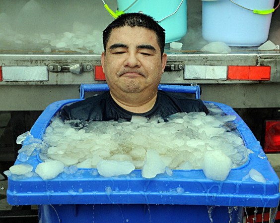2014年8月22日,陳光標(biāo)發(fā)微博稱“陳光標(biāo)坐垃圾桶挑戰(zhàn)冰桶記錄”,圖為陳光標(biāo)坐在充滿冰水的垃圾桶內(nèi)被潑冰水。