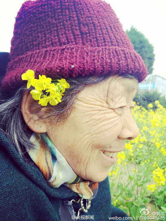 4月4日,網(wǎng)友“牦歌”在微博上曬出了一組照片,題為“你的皺紋比歲月更美”,照片的主角是“我奶奶”。一片金黃的油菜花田中,一位身穿灰色大衣,頭戴棗紅色線帽的老人或轉(zhuǎn)身回眸淺笑,或低頭輕聞花香,還45°角仰望天空,甚至單腳站立擺出“大”字狀。最可愛的要數(shù)老人擷取了一支油菜花插在耳邊,如果不是面龐已布滿皺紋,老人就如同一個(gè)嬌羞的小姑娘。圖為奶奶45°角仰望天空。