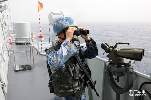 3月21日,海軍第十一護(hù)航編隊(duì)首次獨(dú)立執(zhí)行護(hù)航任務(wù)?!扒鄭u”艦警戒哨正在觀察海面情況。米晉國攝影