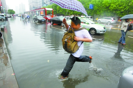 昨天下午3時,記者在東風(fēng)路與文化路交叉口的地下隧道內(nèi)看到,有轎車已被水淹滅了,難以動彈,地下隧道中的積水可沒過輪胎。金水路與東明路交叉口西約100米路南,積水嚴(yán)重,水深幾乎沒過轎車輪胎。豐慶路與三全路交叉口附近的豐慶路小學(xué)門前也是宛如“海洋”,積水沒過自行車大半個車輪。放學(xué)的部分小學(xué)生無法通行,被人背著過路。巡防隊員解釋稱,此處地勢低洼,排水不暢,逢雨必淹,孩子們雨天上下學(xué)很不安全。