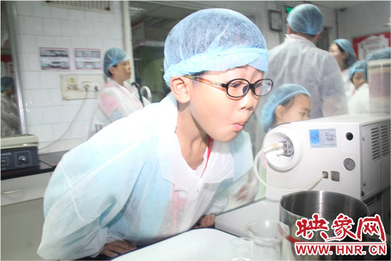 穿上白色的參觀服、戴上一次性帽子,受邀家庭進(jìn)入了檢測(cè)區(qū),參觀了質(zhì)量控制的檢測(cè)工作流程。正在工作的品控員,現(xiàn)場(chǎng)邀請(qǐng)了一名小朋友進(jìn)行了其中一項(xiàng)檢測(cè)--白利度檢測(cè)?!昂?jiǎn)單來講,就是利用密度儀,測(cè)試一瓶飲料的糖度和含氣量?jī)蓚€(gè)指標(biāo)。”品控員張青介紹道。