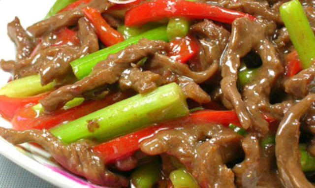 4.鍋內留少許油復上火,放入蔥姜片爆炒,放入芹菜塊,一分鐘左右放入牛肉同炒,放入鹽,糖加水中小火5-10分鐘左右,加味精,最后淀粉勾兌起鍋。