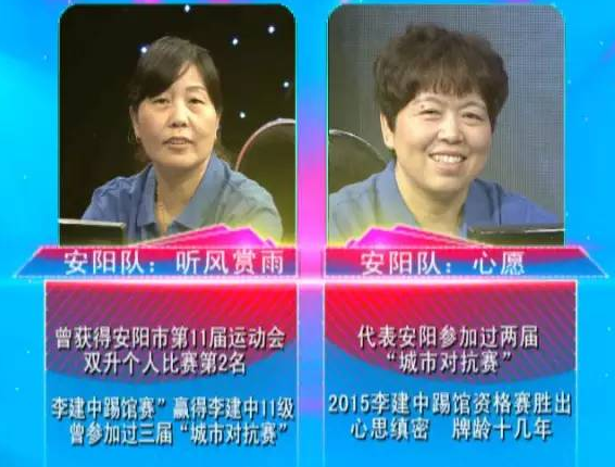 雖然來(lái)的是兩名女隊(duì)員,但是人家巾幗不讓須眉?!奥狅L(fēng)賞雨”曾獲得安陽(yáng)市第11屆運(yùn)動(dòng)會(huì)雙升個(gè)人比賽第2名;2015年“李建中踢館賽”領(lǐng)先李建中11級(jí);參加過三次“河南電視雙升城市對(duì)抗賽”?!靶脑浮痹?015年“李建中踢館資格賽”中勝出;代表安陽(yáng)隊(duì)參加過兩屆“河南電視雙升城市對(duì)抗賽”,牌齡十幾年。