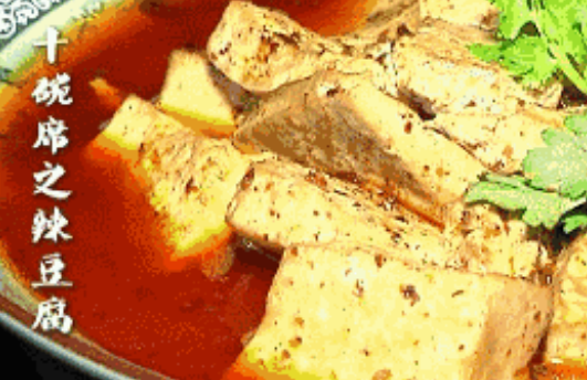 加入切好的老豆腐塊開始燉,湯滾開時放入鹽調(diào)味,在跳動的小火上面煨90分鐘后,香辣軟筋的豫西辣豆腐就出鍋了。