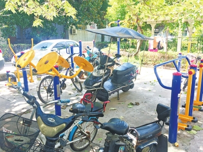 據王女士透露,近段時間,樓下有很多電動車及自行車把健身器材圍住了,有的電動車上還裝有報警器,也不敢觸碰,一碰警報就響個不停,“我們只好到別的地方鍛煉”。