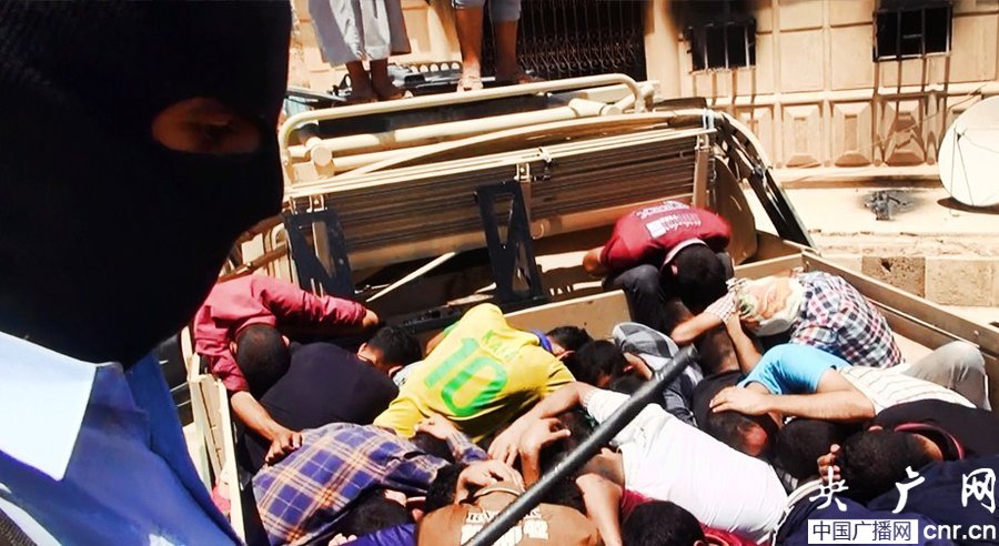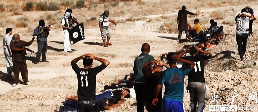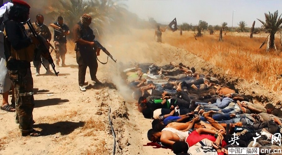 當(dāng)?shù)貢r(shí)間2014年6月14日,伊拉克薩拉赫丁,伊拉克極端武裝“伊拉克和黎凡特伊斯蘭國(guó)”武裝人員處決大量俘虜?shù)囊晾耸勘?/p>