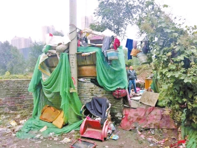 他們從花園路劉莊到鄭上路,走了近2個小時。走到鄭上路須水河西岸時,發(fā)現(xiàn)在一塊荒蕪的墳地中,有一窩棚,隱約看到有身影在走動。近前看到,一位瘦黑的老人站在雨里,正在一簡陋土灶上煮面條。老人身上的衣服已淋濕,陪老人的是一條流浪狗,狗是老人撿的。窩棚很小,僅能容下一人,蜷縮著才能躺下。由于窩棚漏雨,鋪蓋內(nèi)也是濕的。